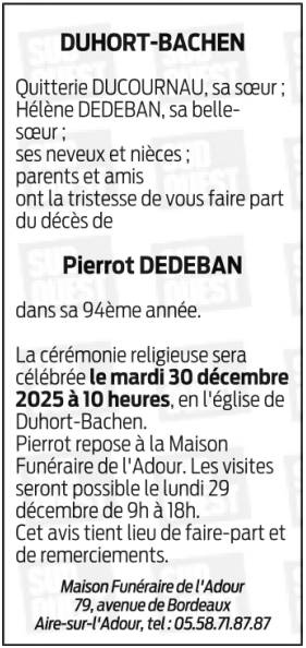 C’est avec une grande tristesse que nous vous annonçons le décès de Pierrot DEDEBAN survenu le vendredi 26 décembre 2025 à Aire sur L Adour. La cérémonie se déroulera le mardi 30 décembre 2025 à 10h00 à l’adresse suivante : Église Saint-Leu - place de la Mairie - 40800 Duhort-Bachen.